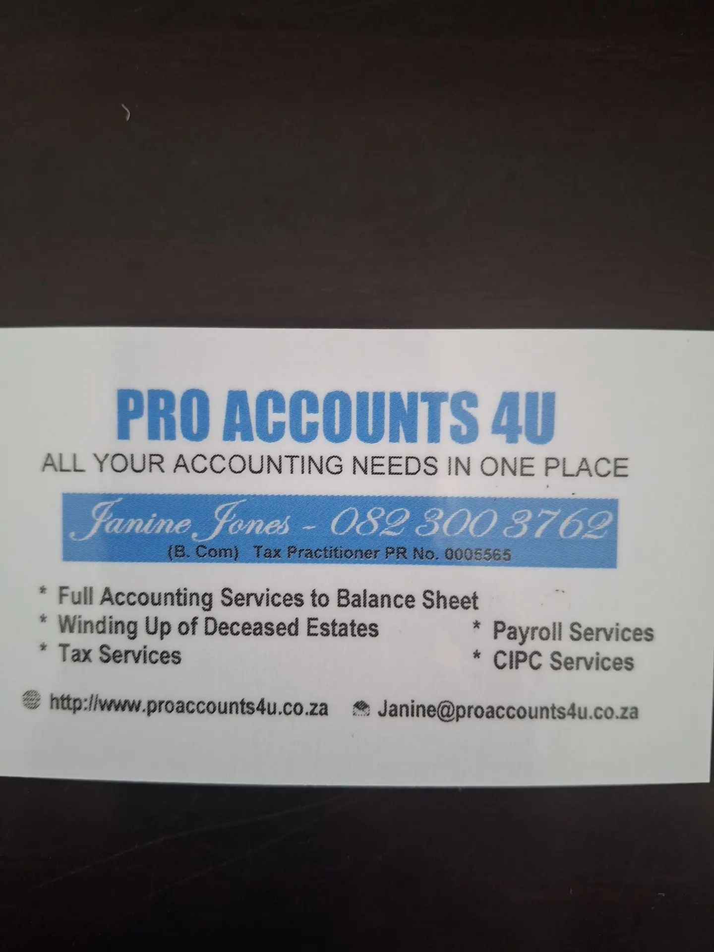 I provide bookkeeping to balance sheet, payroll processing & administration, winding up & administering deceased estates & tax practitioner services, including the completion & submission of VAT, PAYE, income tax & provisional tax returns for individual & corporate entities, as well as attending to SARS’ queries/disputes.  I am a registered Tax Practitioner with SARS & SAIT, with a Bachelor of Commerce degree majoring in accounting & auditing & have a payroll administrator certification.